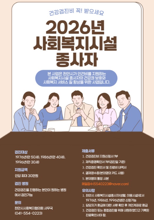 2026년 사회복지시설종사자 건강검진비 지원사업 안내 페이지 정보 작성자작성자 : 천사협 조회조회수 : 9회 작성일작성일 : 26-03-03 15:54 본문 2026년 사회복지시설종사자 건강검진비 지원사업 안내드립니다. 첨부파일 건강검진비 지원 신청서2026년 최신본.hwp (20.5K) 0회 다운로드 | DATE : 2026-03-03 15:54:09 목록 다음글2026년 예산서 공고 25.12.31
